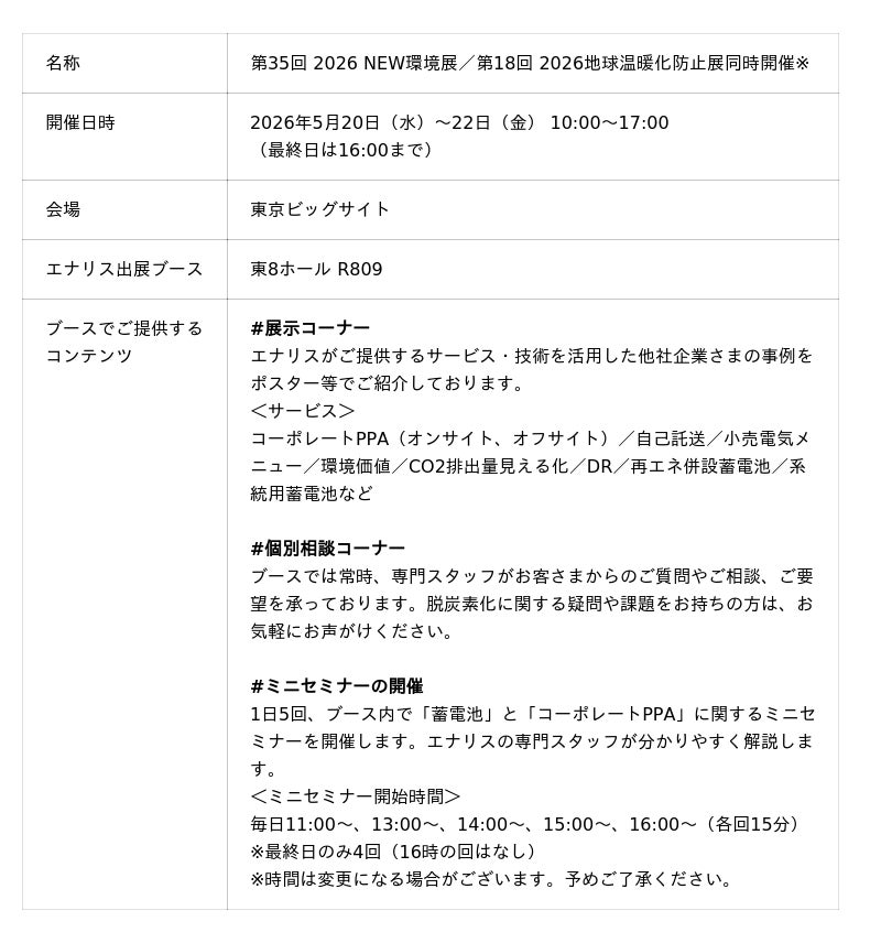 株式会社エナリス(本社:東京都千代田区、代表取締役社長:鈴木吾朗、以下、エナリス)は、2026年5月20日(水)~22日(金)に東京ビッグサイトで開催される「第18回 2026地球温暖化防止展」に出展いたします。